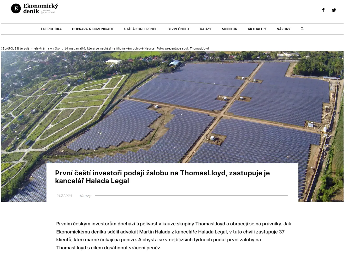 The creditors’ group brings together holders of various investments that ThomasLloyd offered to Czech investors. These include, in particular, bonds issued by ThomasLloyd Cleantech Infrastructure (Czech) a.s., ThomasLloyd Cleantech Infrastructure (Liechtenstein) AG, and shares in German limited partnerships of ThomasLloyd.